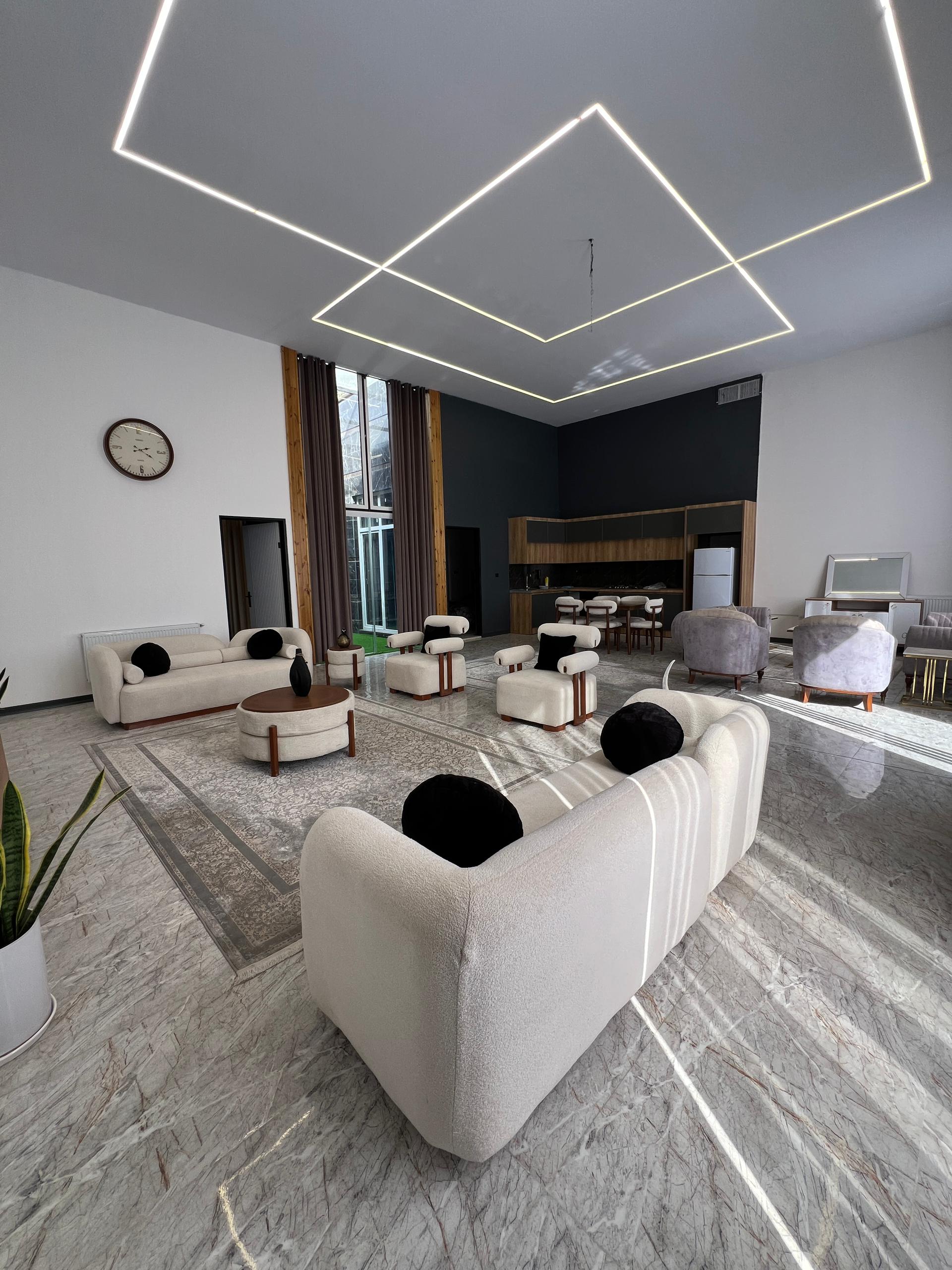 سالن نشیمن بزرگ با نور طبیعی و سقف مدرن نورپردازیشده، جلوهای چشمنواز به فضا بخشیده است.